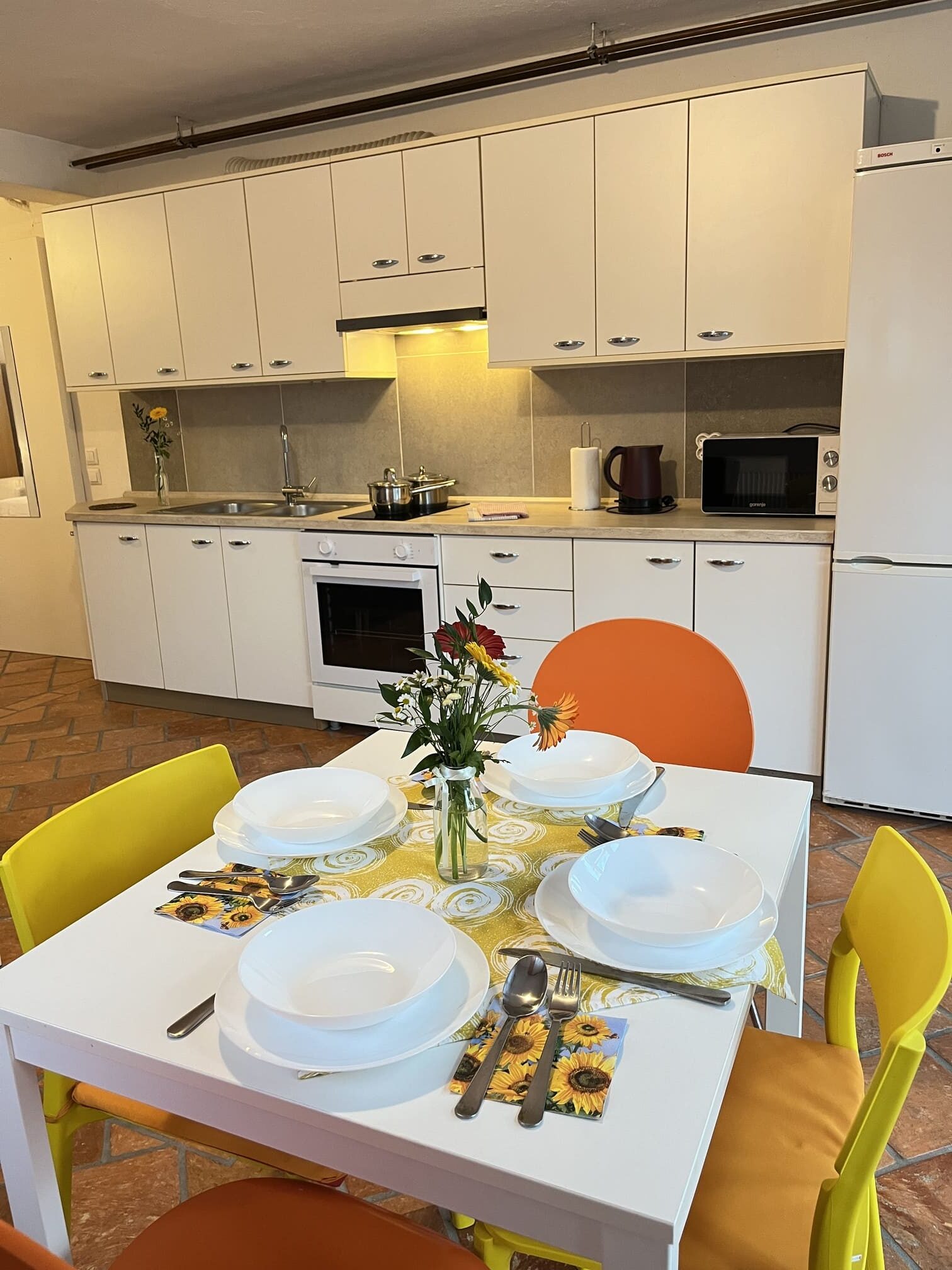 Popolnoma opremljeno kuhinjo s hladilnikom