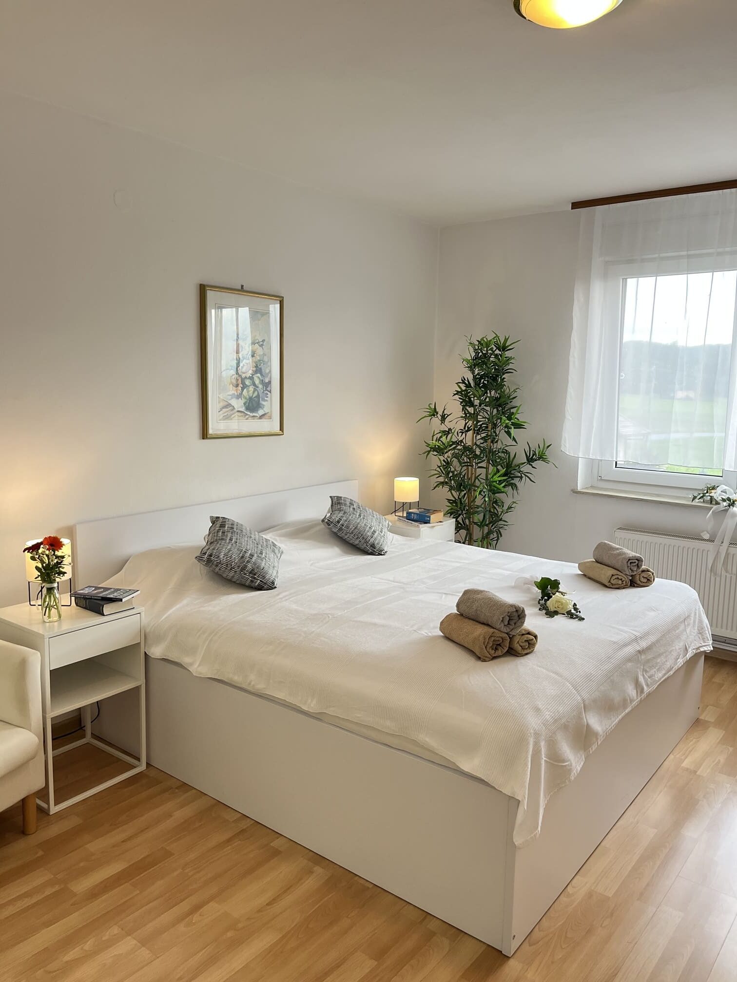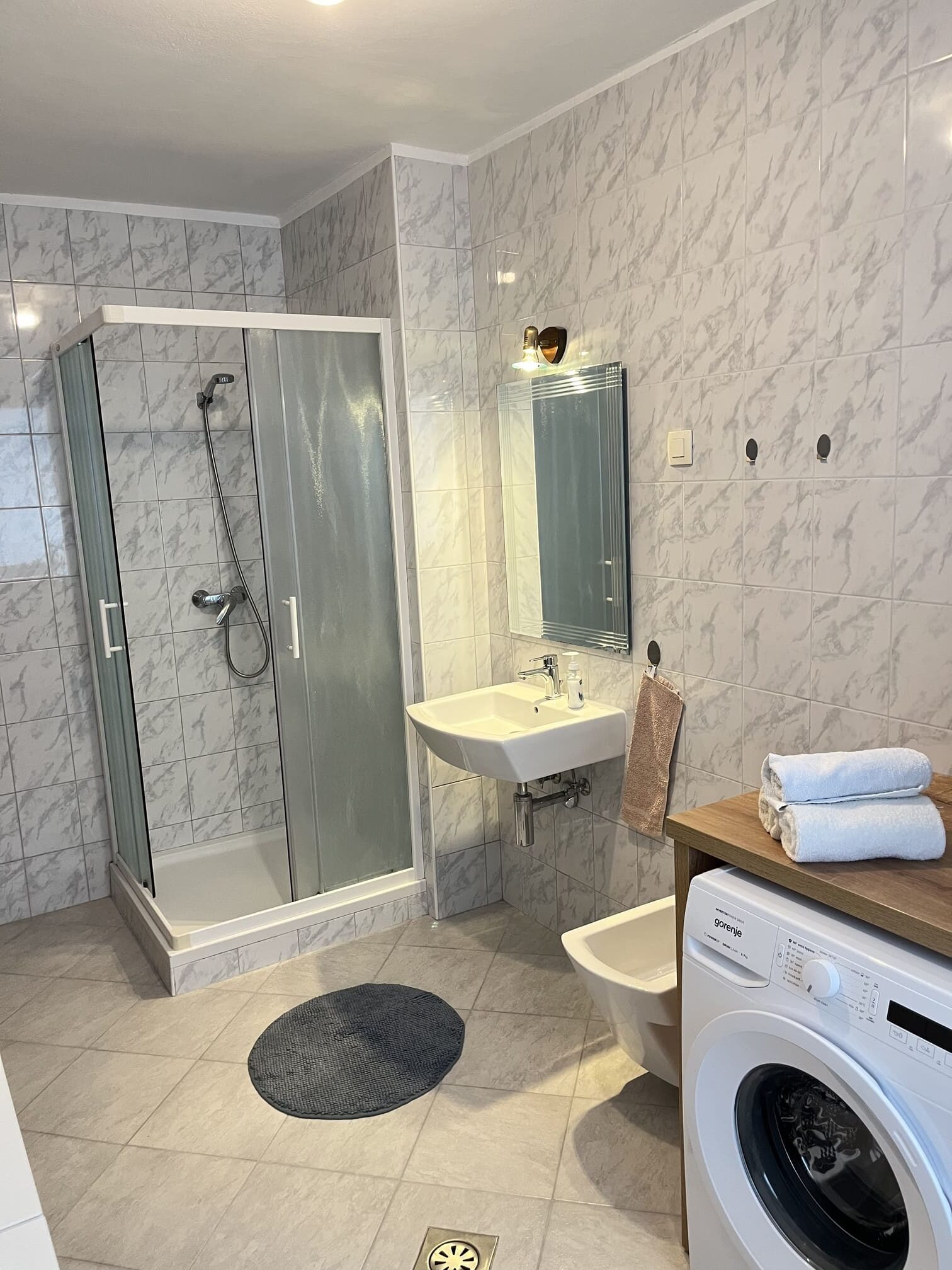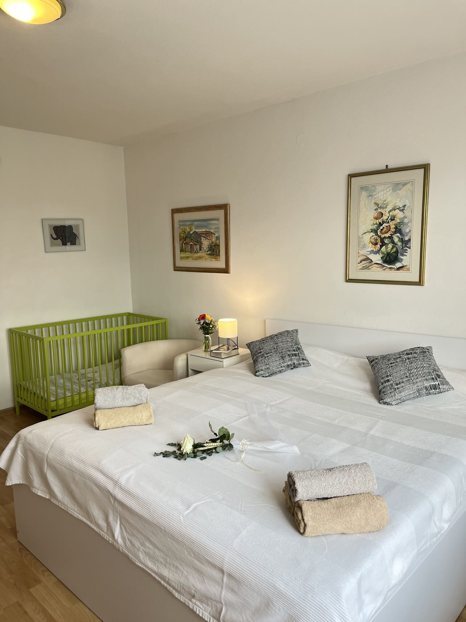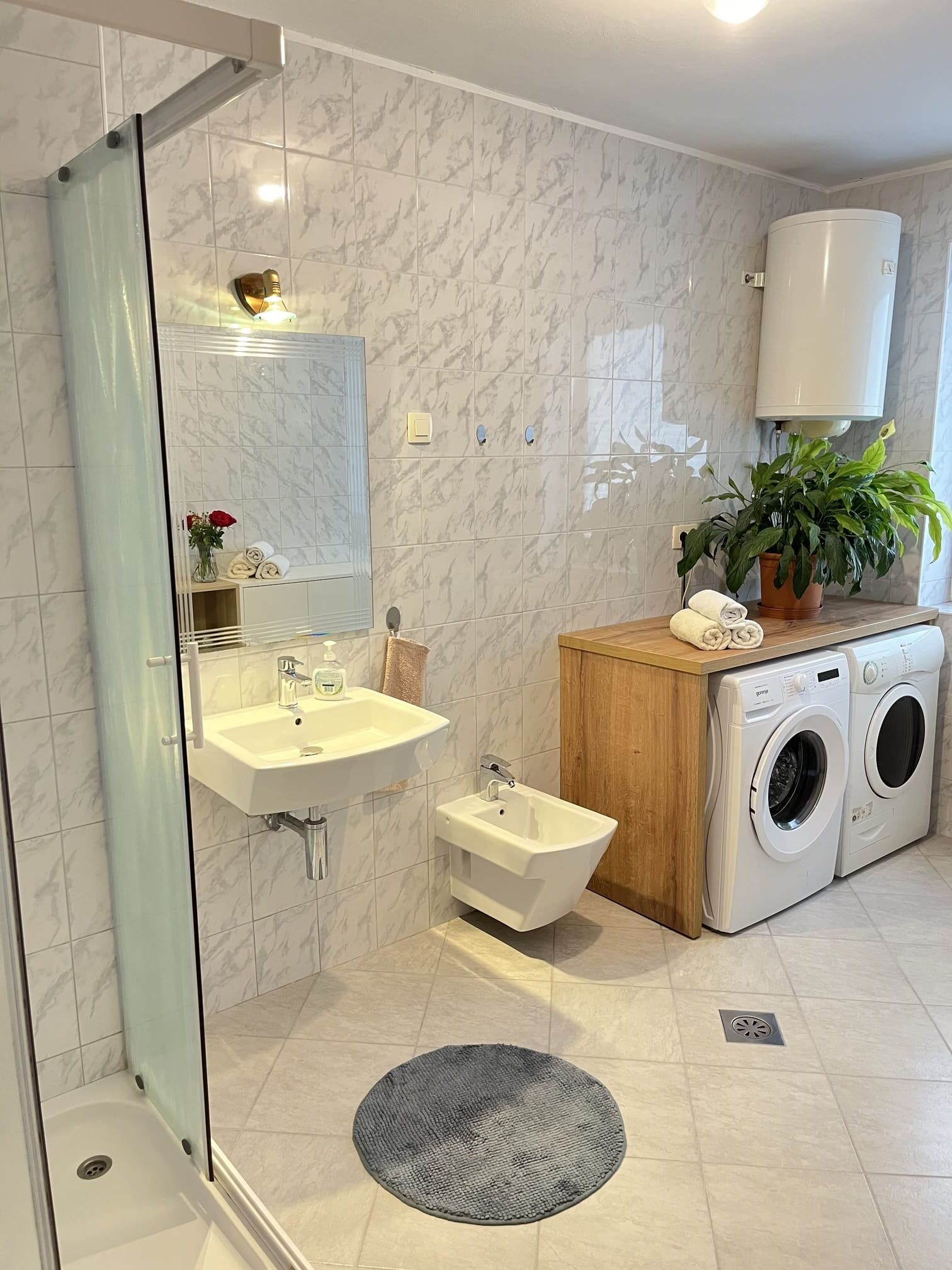 V kopalnici se nahajajo prha, pralni ter sušilni stroj. V prvi spalnici je velika zakonska postelja z merami 180 x 200cm in ena otroška posteljica. V drugi spalnici so tri enojne postelje z merami 90 x 200. Opremljena kuhinja nudi vse, kar potrebujete za ugodno bivanje. Med drugim hladilnik z zmrzovalnikom, številnik in mikrovalovno pečico. Dnevna soba je opremljena s HD televizorjem. V apartmaju se nahaja tudi manjša soba, ki služi kot delovni kabinet. Opremljena je s pisalno mizo in pisarniškim stolom. V celotnem apartmaju je na voljo brezžična internetna povezava.