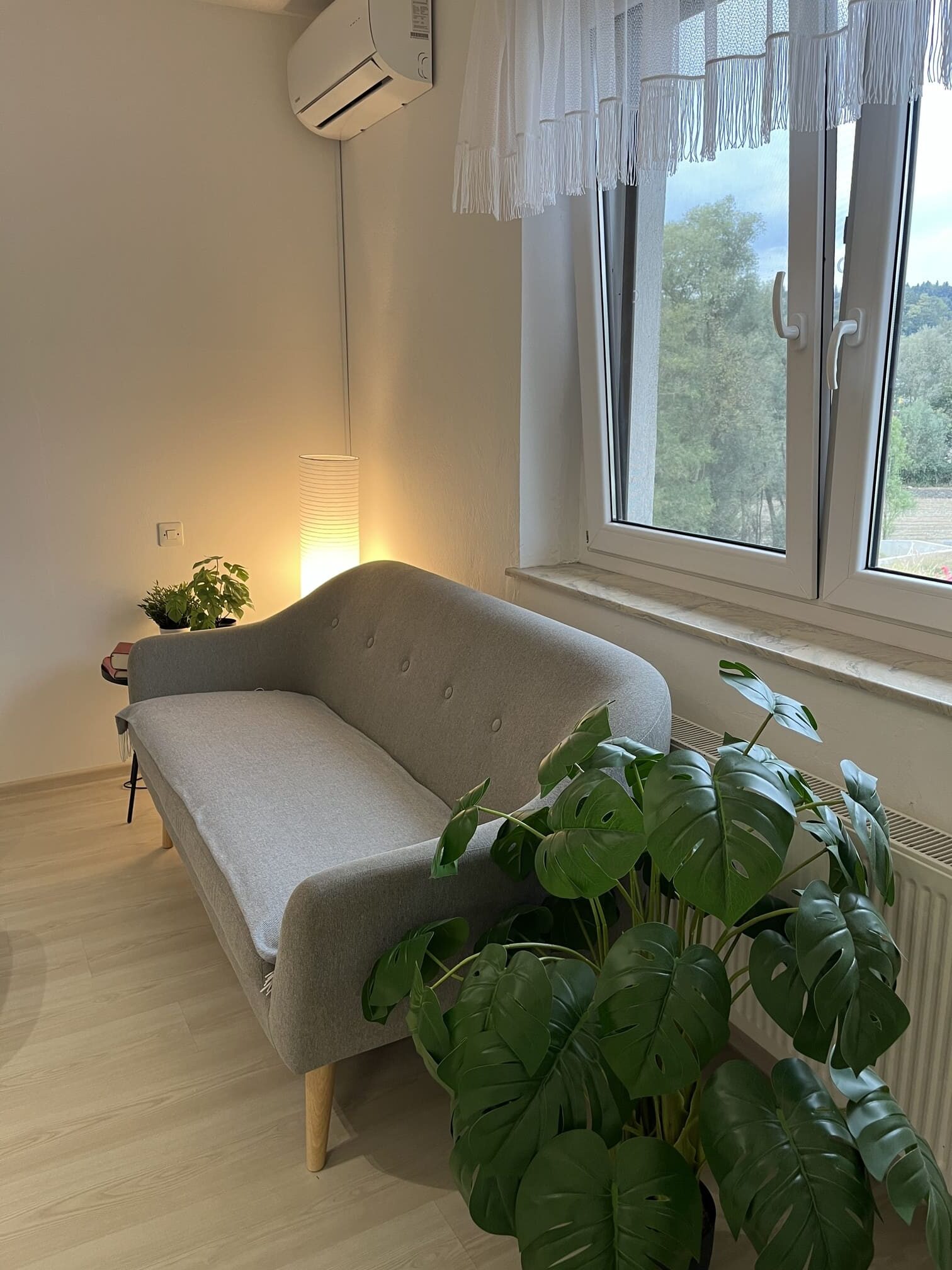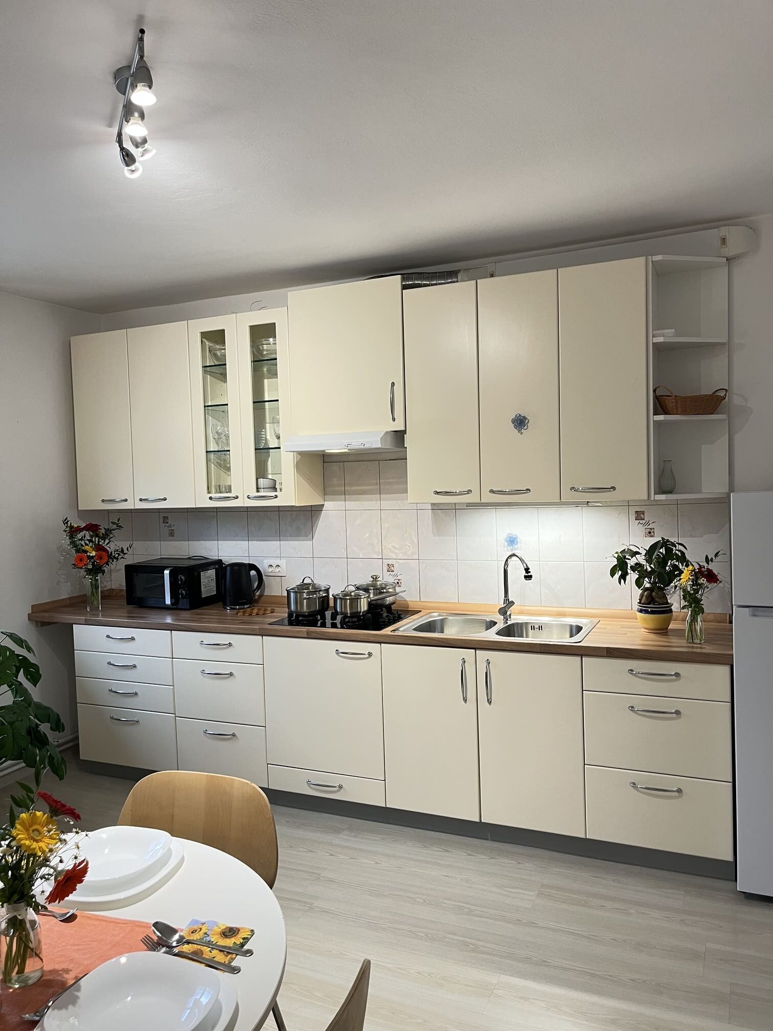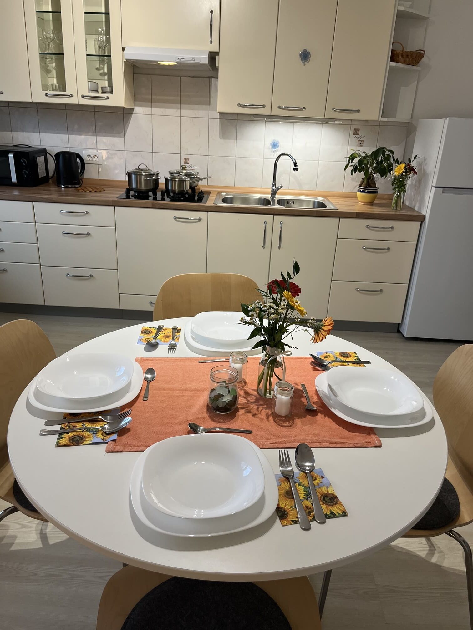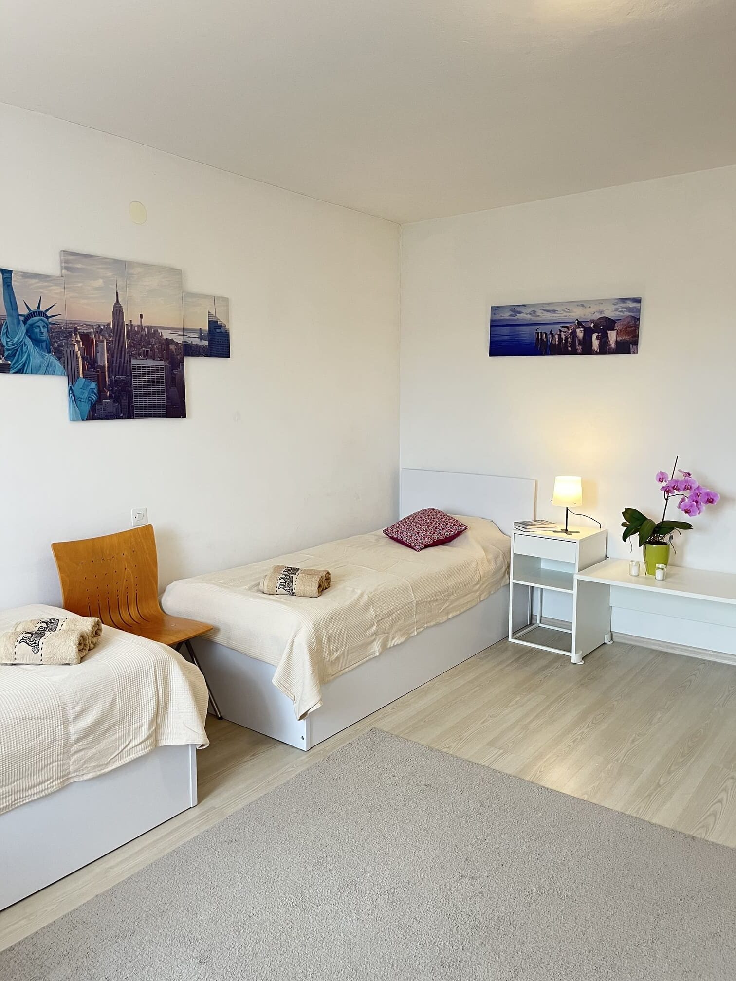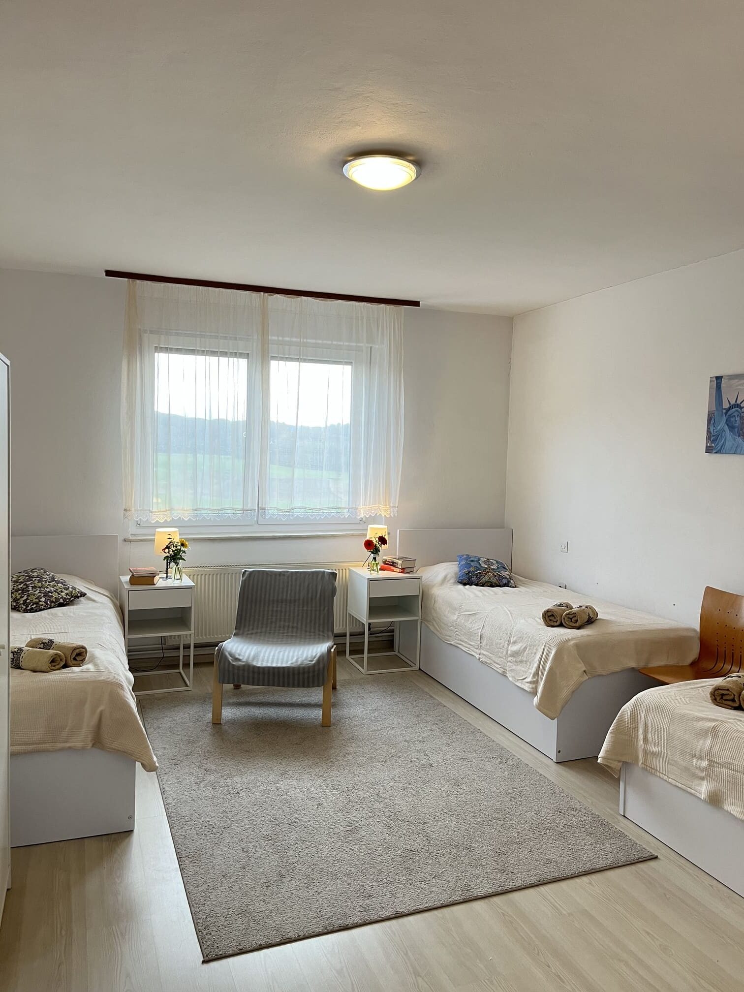 Apartma Booky1 obsega kar 95 m2 in je primeren za nastanitev večih oseb hkrati. Nahaja se v prvem nadstropju objekta, ima velika okna, ki omogočajo veliko svetlobe skozi večji del dneva. Ogreva se preko radiatorjev povezanih s centralno pečjo, pozimi pa ga ohlaja klimatska naprava.